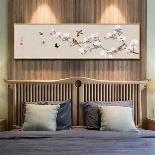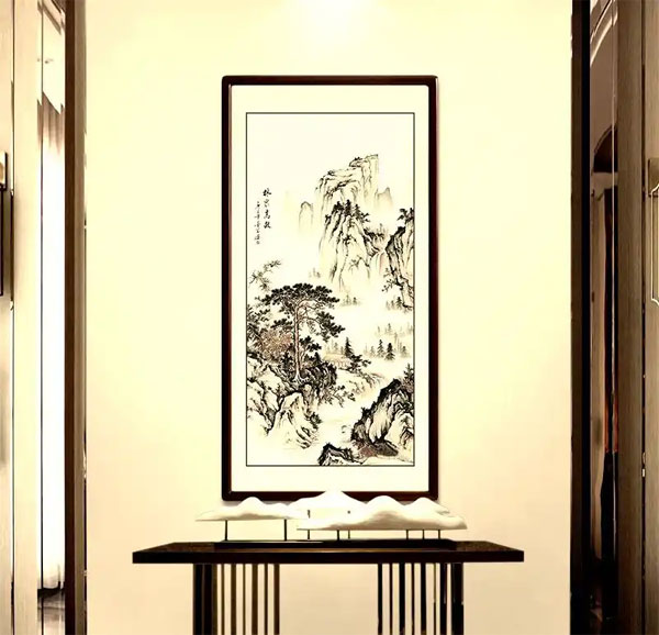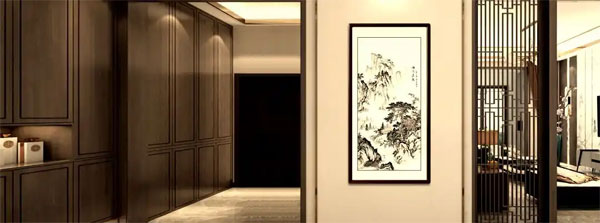 接下来,让我们转向卧室的挂画选择与布置。在卧室中,挂画的位置通常位于床头或床头柜上方,而卧室应选寓意和谐的花鸟画,题材方面,推荐选择寓意和谐温馨的画作。在玄关与走廊,这两处常被人们忽视的“风水宝地”,其实也大有讲究。在玄关处挂画,其中心点的位置以距离地面一米五至一米六为宜,这样的高度不仅利于观赏,还能为家居增添一份别样的雅致。
