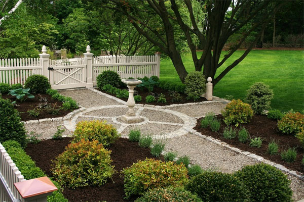 如果你家小院子面积较小,在你的花园中心位置采用对称式节点布局,可以为你家庭院效果带来一丝优雅。例如对称的种植池以及平地树池会扩展花园庭院的面积,主景乔木规划在边界位置,能够起到视觉上更加均衡和突出的效果。立柱小雕塑在细节上提升了花园庭院的风格印象。无论是自然石的基座和菠萝造型柱头,都会更加地亲近乡土自然、以及家乡的农业种植风景。而细小的豌豆砾石增强了花园庭院生态蓄水的能力。