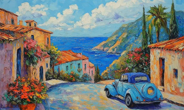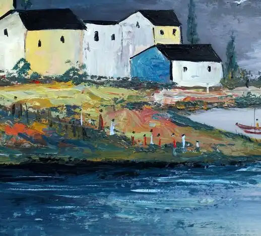 特色小镇油画_海边小镇风景油画定制_安徽油画定做