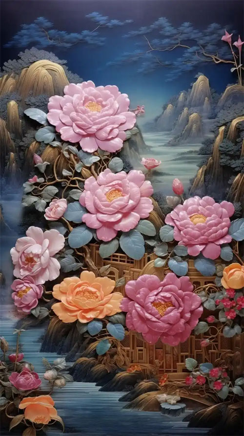 3D立体牡丹浮雕画_合肥浮雕挂画定做